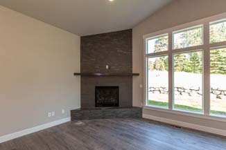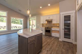 Open Kitchen, Great Room, Dining Room w/ tall vaulted ceilings and windows